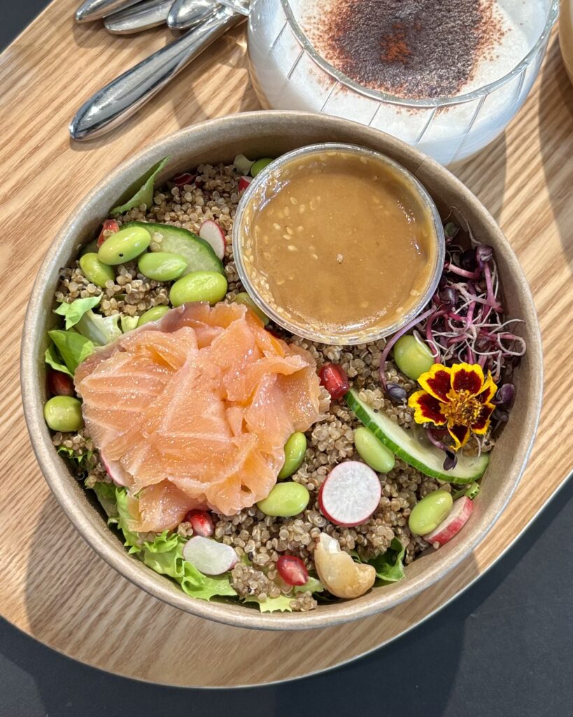 • la salade au saumon fumé, quinoa, edamame, radis et pousses, avec une douce vinaigrette, colorée et goûtue. La couche de salade du dessous était cependant sans plus, un peu sèche et impersonnelle.