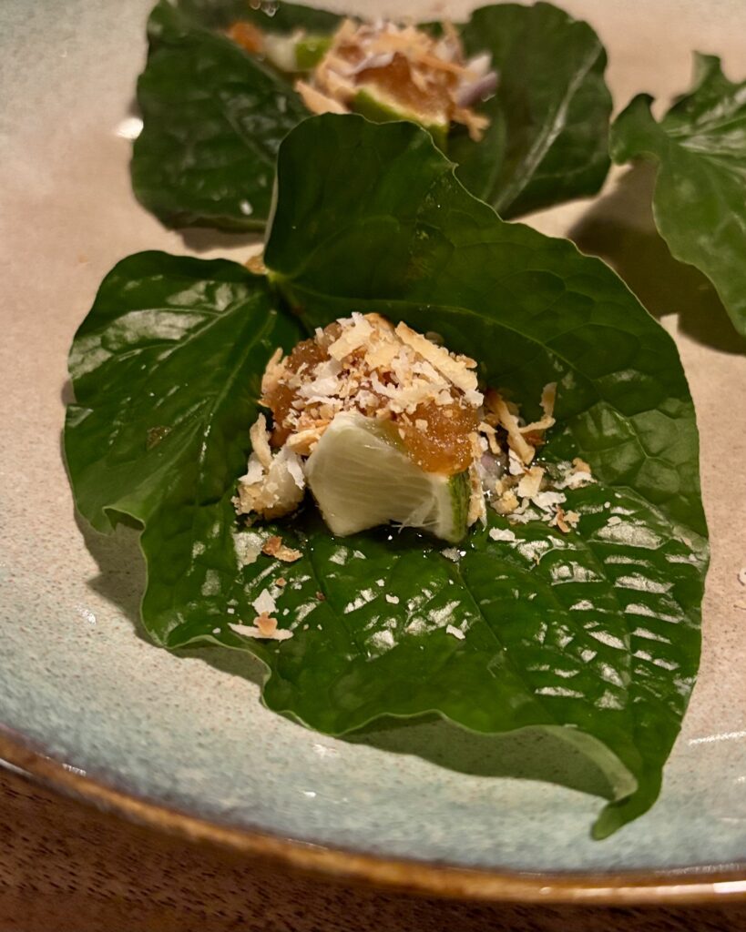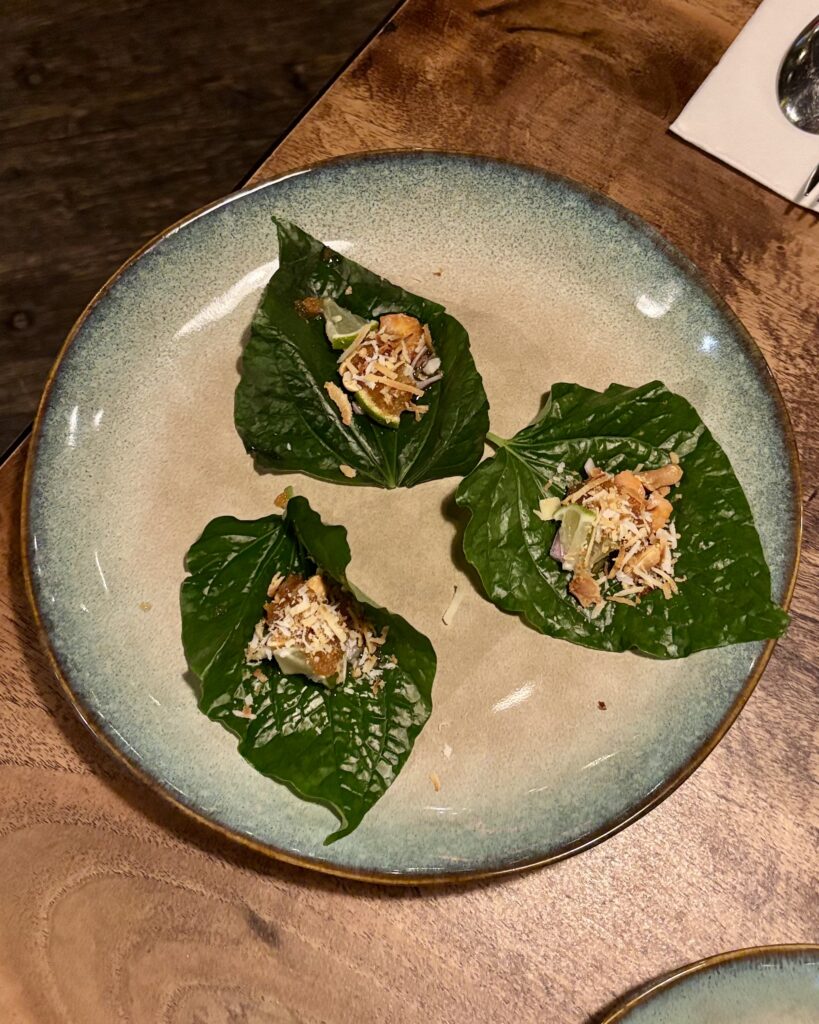 - 3 miang kham (10 CHF), soit d’originales bouchées thaïes aux feuilles de betel, passablement pimentées et fraiches, avec une touche de citron vert