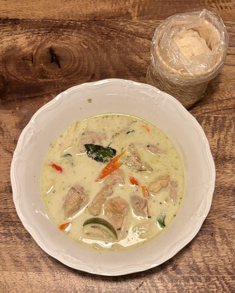 - kaeng khiao wan (23 CHF), du poulet au curry vert, noix de coco et petites aubergines thaïes, manger avec avec du riz collant (5 CHF)