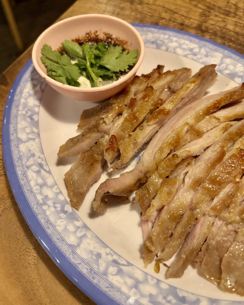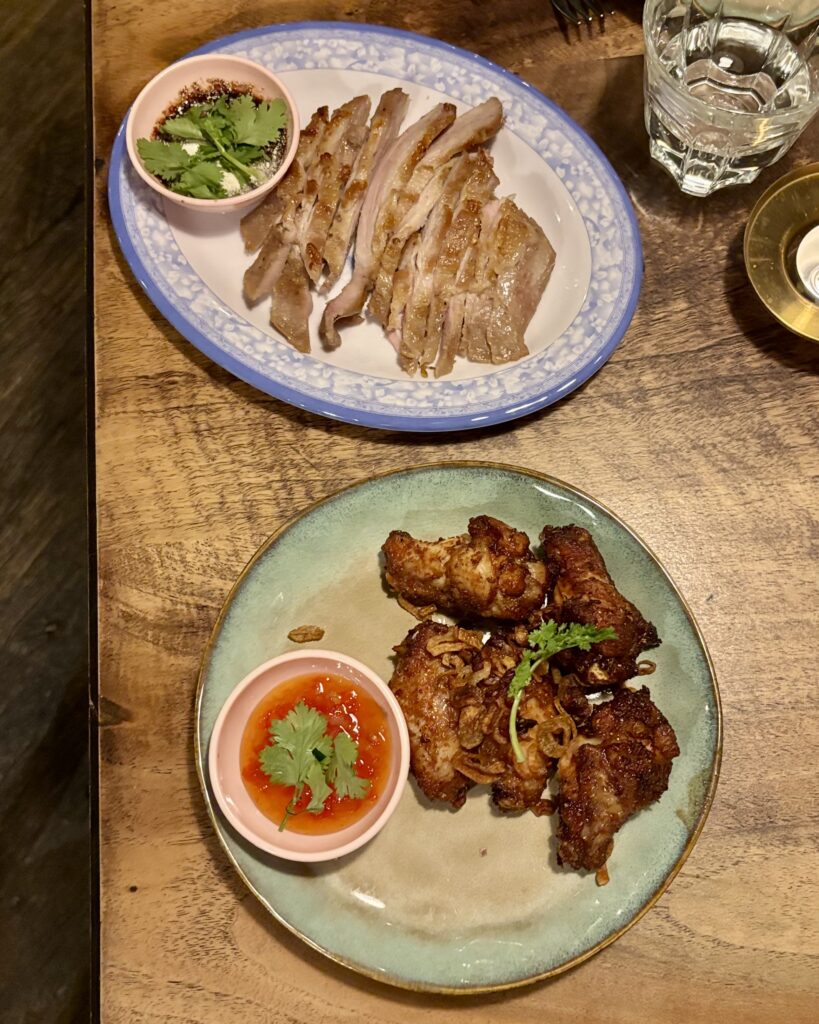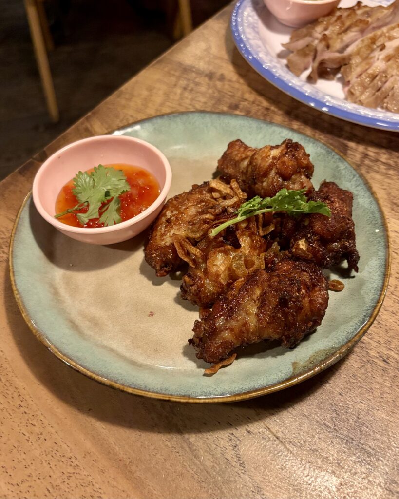 - 5 pièces de goi tod Hat Yai (9.5 CHF), du poulet frit de Hat Yai (une province du sud de la Thaïlande), servi avec une sauce aigre douce maison. Bon et tendre, avec une friture non panée (ce reste moelleux et pas crousti-frit, bien qu’il y ait de l’oignon frit sur le dessus).