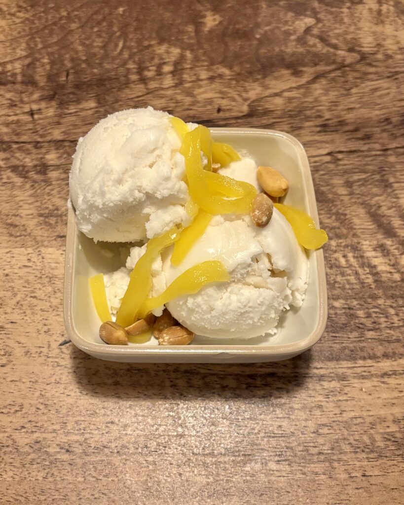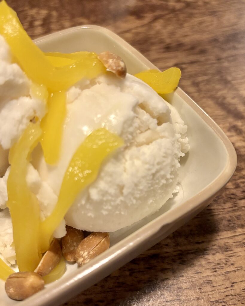 - de la glace maison à la coco (10 CHF), servie avec du fruit du jaquier fondant et quelques cacahuètes grillées. Une texture assez neigeuse plutôt qu’onctueuse, entre glace et sorbet, et une portion très généreuse (2 boules): pour les petites faims sucrées, cela serait peut-être intéressant d’également proposer une seule boule.