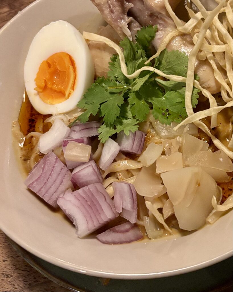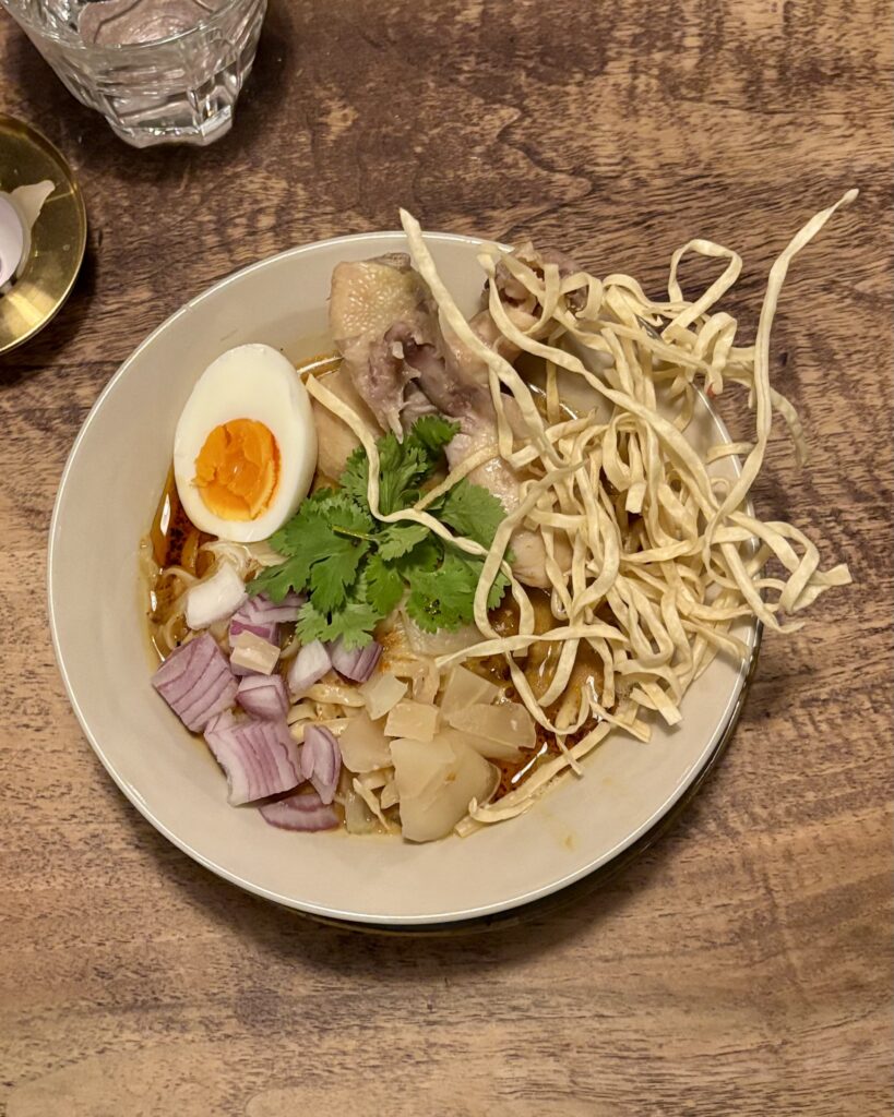 - un bol de khao soi gai (26 CHF), soit une soupe de nouilles de blé aux tendres cuisses de poulet et curry maison agrémenté de pickles de fleurs de moutarde, oignon rouge cru, coriandre, huile pimentée maison et nouilles croustillantes sur le dessus pour la déco. L’intitulé autour du poulet ne mentionne pas qu’il s’agisse d’une soupe, ce qui peut être un peu surprenant.
