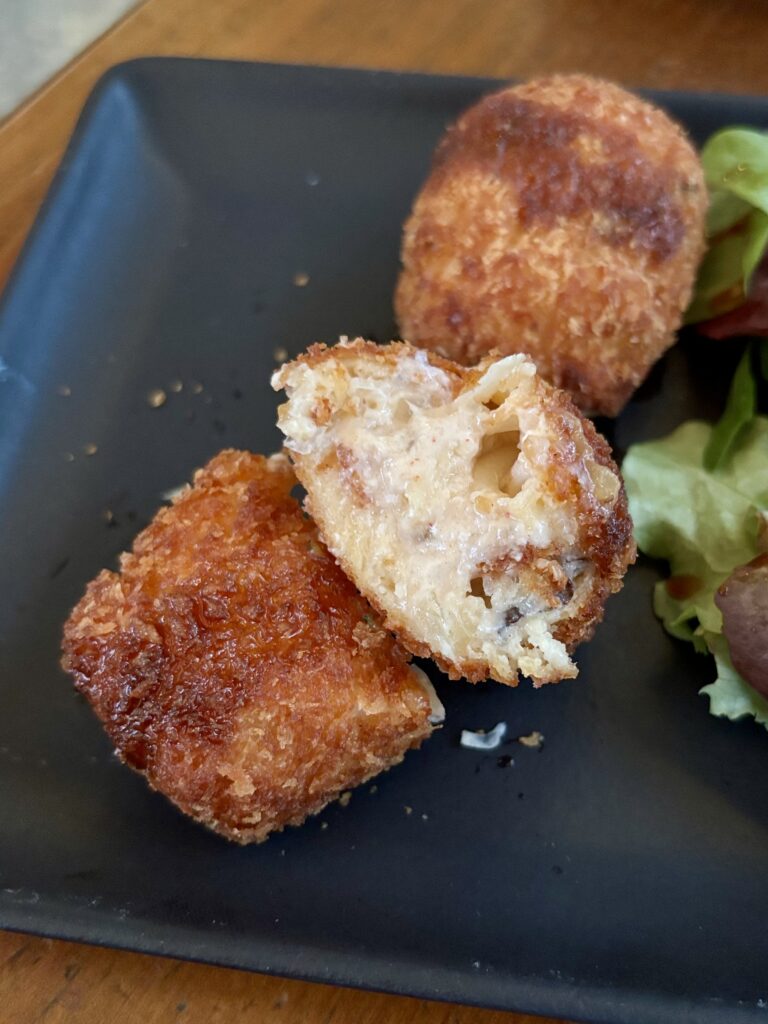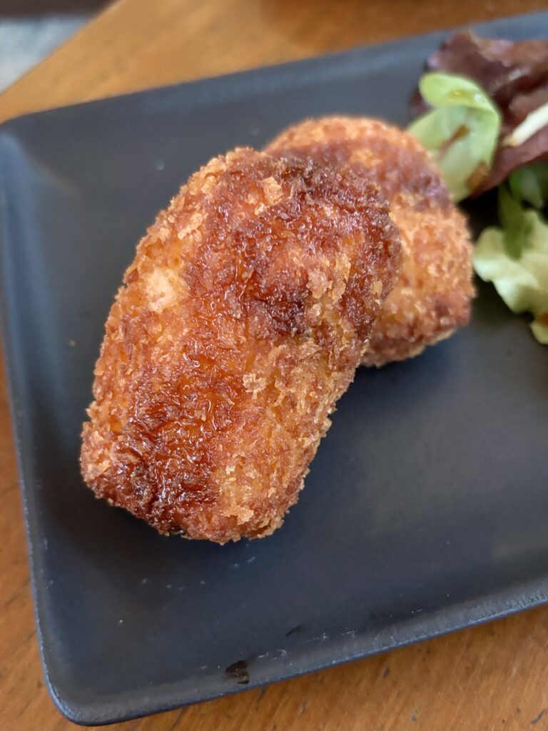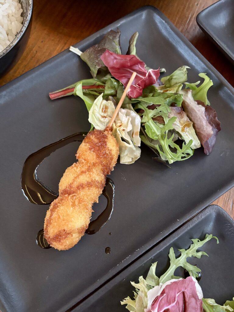 - un duo de délicieuses korokke au shitake (14 CHF), sorte de grosses croquettes pouvant faire penser à des arancini ovalés, avec un coeur moelleux. La photo générée par IA du menu n’est pas très représentative, mais le goût y est.
