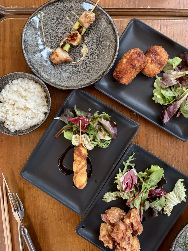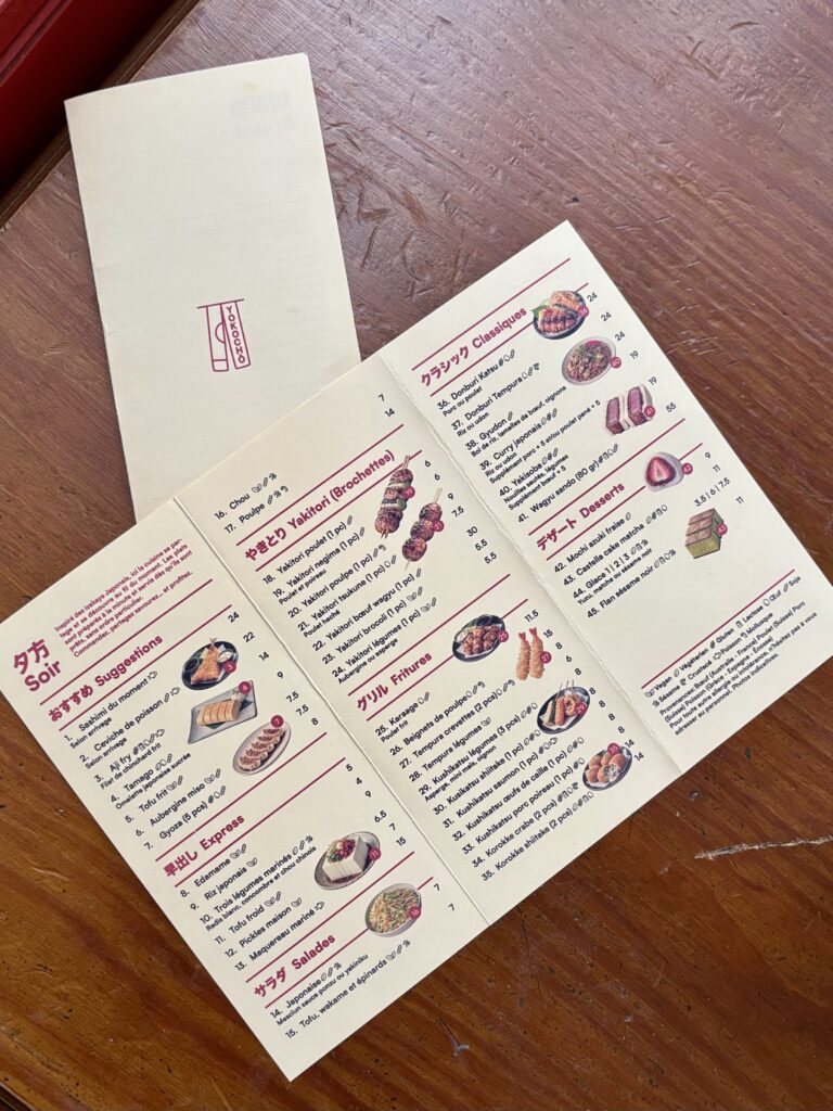 Au menu du soir? En plus de japanese sours qui se boivent tout seuls (notamment celui au yuzu), l’on y trouve des suggestions du moment (7.5-24 CHF), des petits plats « express » servis rapidement (edamame, riz, plats froids, 4-15 CHF), salades (7-14 CHF), yakitori (brochettes allant des légumes au wagyu, 5.5-30 CHF), excellentes fritures (6-15 CHF), plats principaux à base de riz de type donburi/curry/yakisoba ou sando de wagyu, 19-55 CHF). Des gyozas maison arriveront peut-être dans un second temps, quand la cuisine sera mieux rodée (et aura plus de temps pour les façonner) dans les semaines à venir.