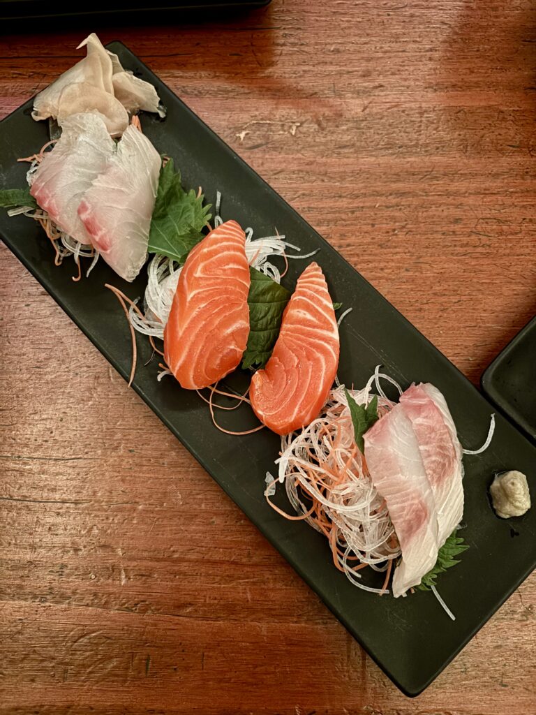 - l’élégante assiette de sashimi du jour (24 CHF les 6 tranches de sériole, dorade et saumon ce soir-là)